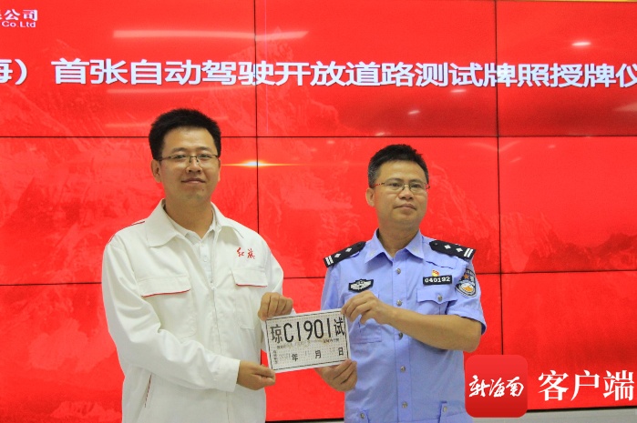 当天下午,在海南热带汽车试验场,海南首张智能汽车道路测试牌照发放给一汽红旗E-HS3智能网联汽车,有效期为三个月,到期可申请延期。