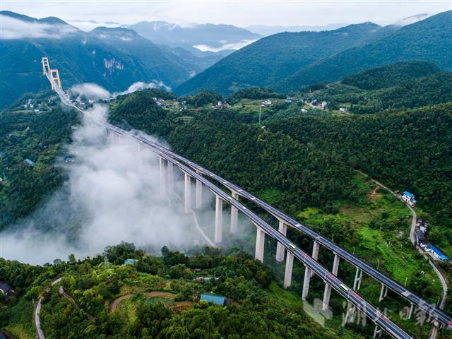 8月24日,地处鄂西境内的沪渝高速公路巴东四渡河特大悬索桥云雾缭绕,宛如仙境。四渡河特大悬索桥地处湖北宜昌市与恩施州交界处,是沪渝高速公路控制性桥梁工程, 大桥全长1365米,是当年中国在深山峡谷里修建的全球最长悬索桥。截至目前,湖北恩施土家族苗族自治州境内高速公路里程达588公里。利万、宣鹤、建恩等高速公路建成通车,鹤峰东、宣咸高速全面开工建设,建恩北段、利咸、巴张等高速公路前期工作有序推进。全州88个乡镇中75个通达国省道二级公路,“千公里”绿色生态旅游公路全面建成。(视界网 文林 摄)