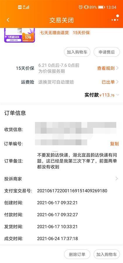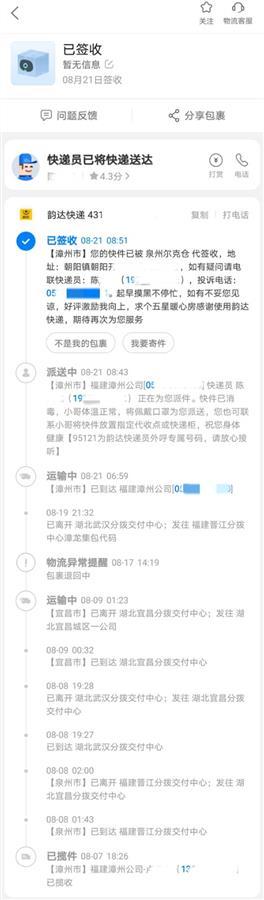 阿慧是一名资深网购达人,6月中旬,她通过淘宝旗舰店购买了一款防晒霜,卖家也是通过韵达快递发货。包裹也是到“湖北宜昌分拨中心”后,就无法投送到下一环节。在“湖北宜昌分拨中心”搁置几天后,物流信息显示“消费者拒收”,就退回到卖家了。