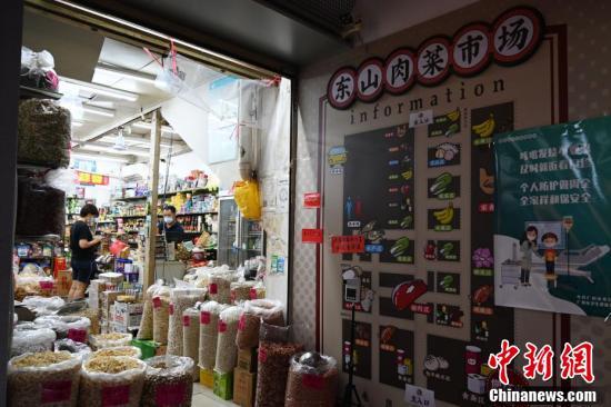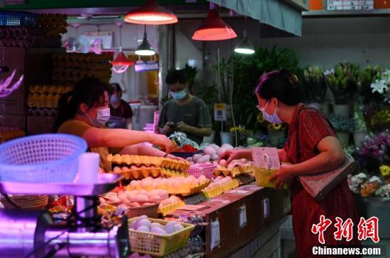 8月25日,市民在广东省广州市东山肉菜市场选购食材。广州东山肉菜市场经创新改造“颜值”提升,设计细节保留岭南市井气息,打造充满设计感的网红肉菜市场。 中新社记者 陈楚红 摄