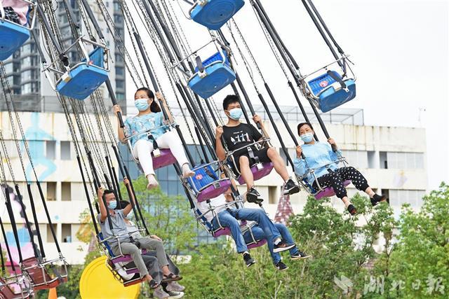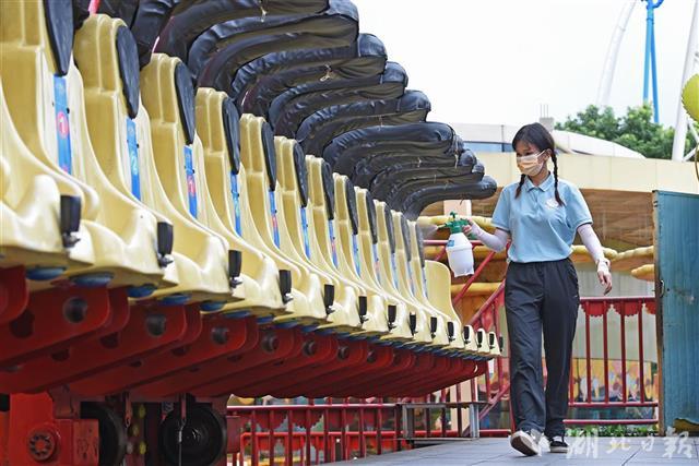 游客入园均需佩戴口罩、亮码测温,园区内游乐设施每客每座不间断消毒,并在醒目位置为游客提供自助消毒。(湖北日报全媒记者 李溪 通讯员 高颖 摄)