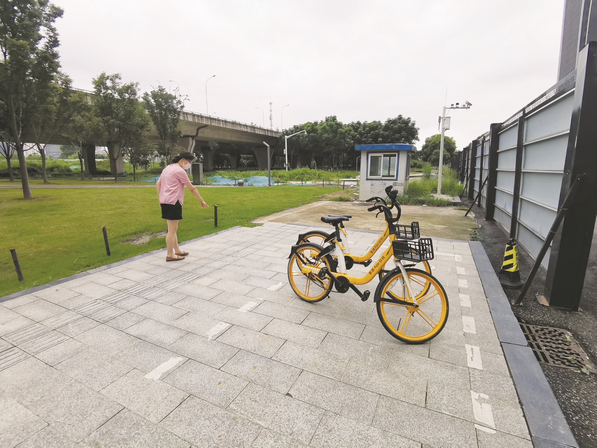 前日下午,记者陪同胡女士来到事发现场。云霞路和珠江路交会路口正在整修,马路一侧立着围挡,旁边放着“请勿泊车”的锥筒。非机动车道边的草坪上钉着多根木桩,但铁丝已被拆除。