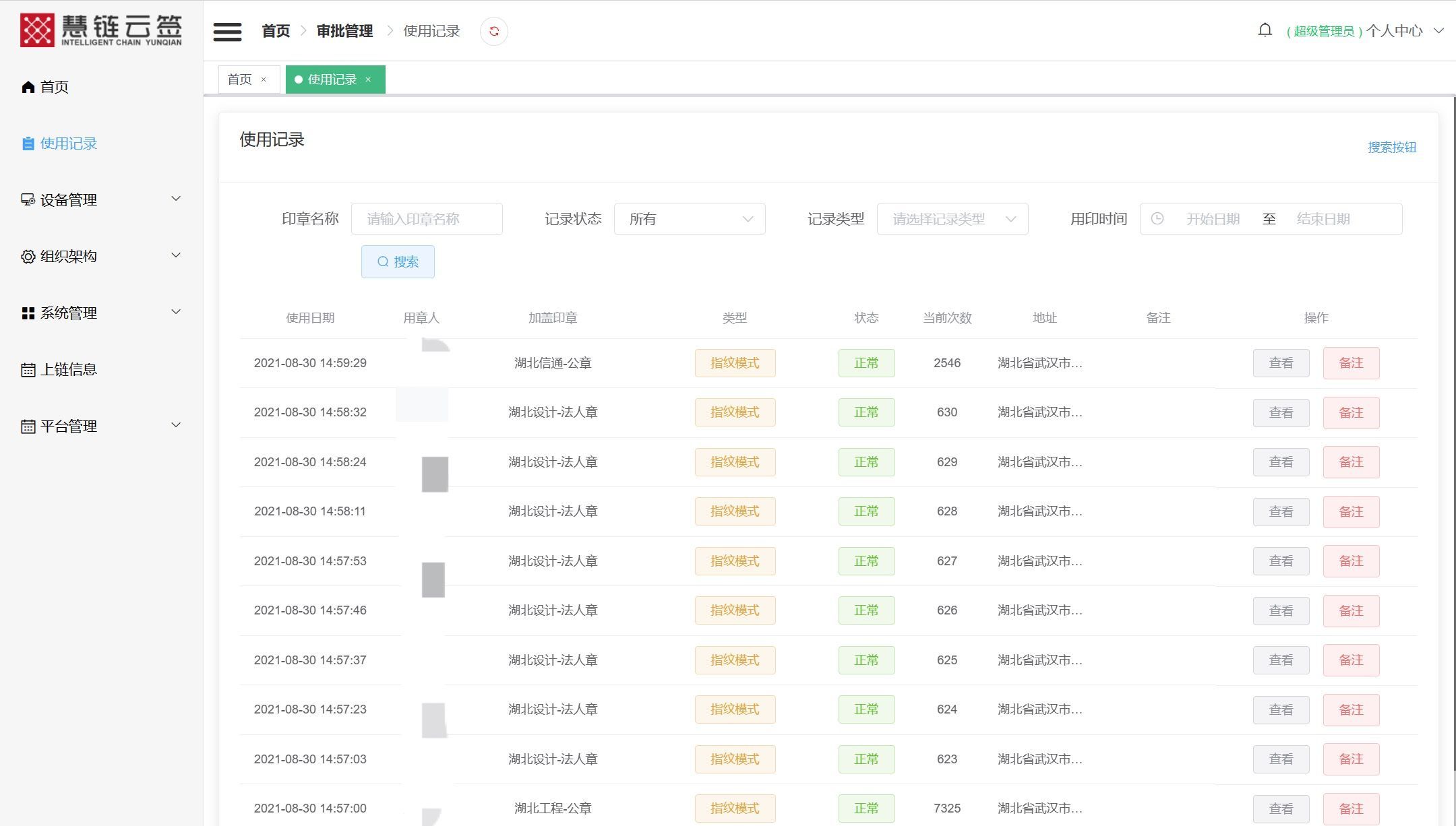“在传统盖印过程中,合同签署方对已盖章的印章难以验真,我们通过区块链技术来解决该痛点。”在电脑端的印章管理应用界面,记者可以看到每一枚智能印章的每一次盖章记录,包括日期、用章人、印章编号、解锁方式、地址、印章使用次数、盖章文件照片等详细信息,全面掌握印章的使用过程。