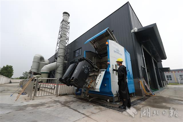 8月29日,在襄阳市樊城区家庭厨余垃圾处理站,员工在清洗垃圾桶。