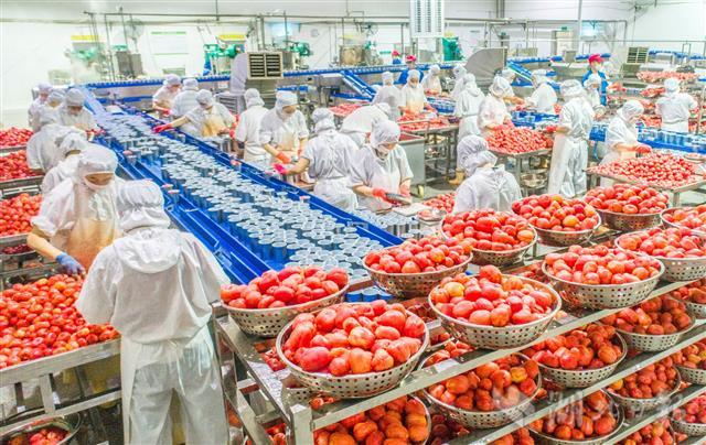 8月28日,秭归屈姑国际农业集团员工在果蔬自动化加工生产线上加工番茄罐头。面对严峻复杂的海运形势,秭归县食品加工企业,将当地丰收的脐橙、番茄、黄桃等各种水果蔬菜生产加工成罐头、果干等产品,稳住外贸出口的同时,通过创新电商直播带货“新零售”、借助能源国企网络、开发烘焙和餐饮网点、开设旅游体验直营等办法,拓展国内市场销售渠道,助力农民增收,并实现稳定就业。(视界网 王罡 摄)