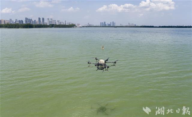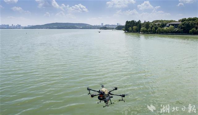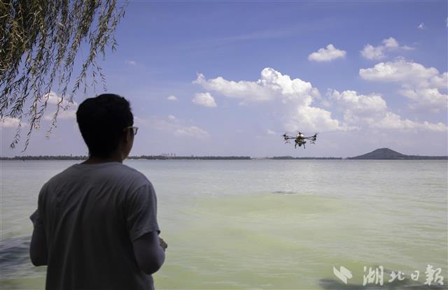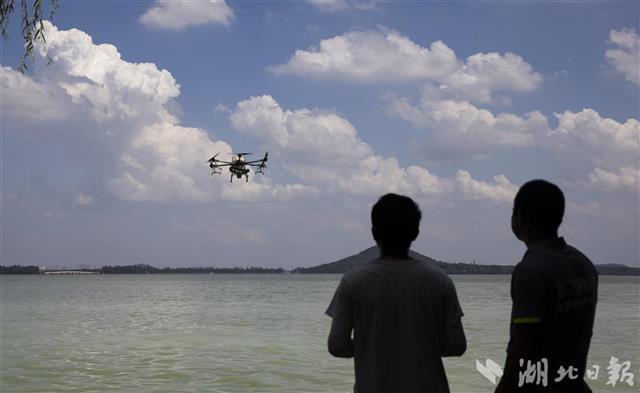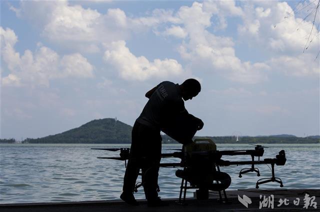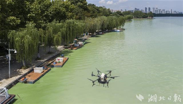 8月30日,工作人员操作无人机在武汉东湖水域喷洒生态修复剂,清除湖面蓝藻。因武汉近期连续降雨,东湖局部出现暴发蓝藻水华现象。为防止蓝藻水华往湖面深处蔓延,武汉东湖风景区组织工作人员利用多架无人机同步作业,向湖中喷洒药物,清除蓝藻,净化东湖水质。(湖北日报全媒记者 柯皓 摄)