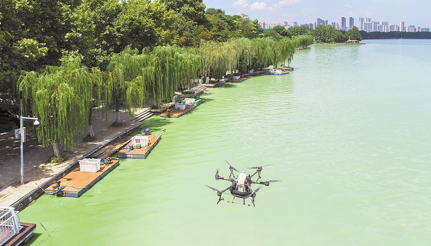8月30日,工作人员操作无人机在武汉东湖水域喷洒生态修复剂,清除湖面蓝藻。因武汉近期连续降雨,东湖局部出现爆发蓝藻水华现象。为防止蓝藻水华往湖面深处蔓延,武汉东湖风景区组织工作人员利用多架无人机同步作业,清除蓝藻,净化东湖水质。