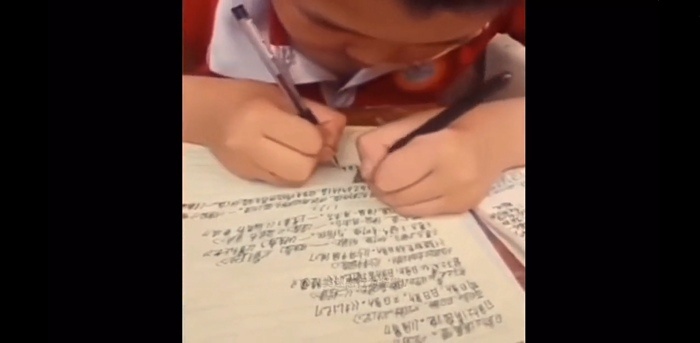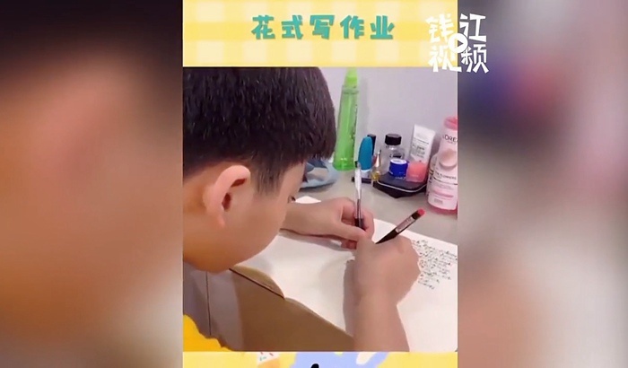 重庆市江北区的一个小朋友,在临近暑假结束狂赶作业。在视频里他一边擦泪狂写作业,一边不时大喊奥利给,给自己加油打气。