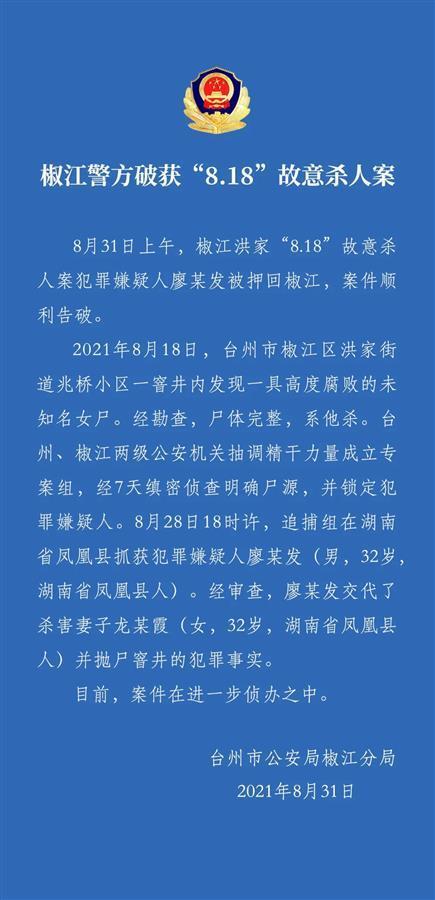 台州市公安局椒江分局通报称,8月31日上午,椒江洪家“8.18”故意杀人案犯罪嫌疑人廖某发被押回椒江,案件顺利告破。8月18日,台州市椒江区洪家街道兆桥小区一窨井内发现一具高度腐败的未知名女尸。经勘查,尸体完整,系他杀。台州、椒江两级公安机关抽调精干力量成立专案组,经7天缜密侦查明确尸源,并锁定犯罪嫌疑人。