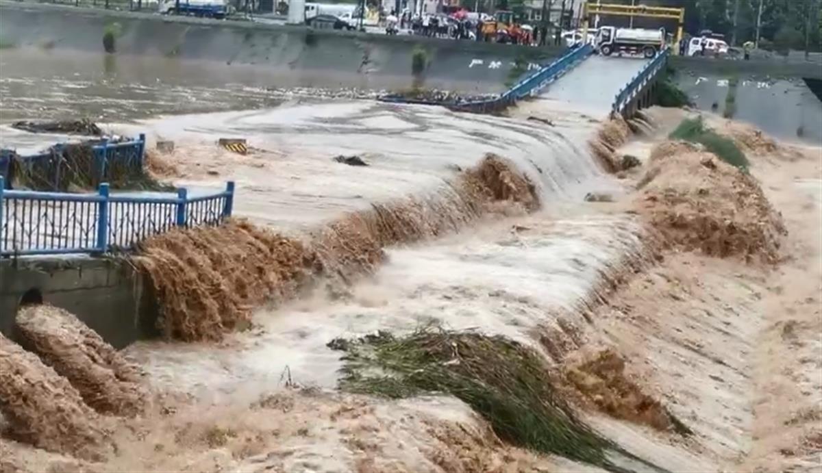 据网传视频显示,河水已经漫过了漫水桥,湍急的河水从漫水桥的多个桥洞急流而下。漫水桥中间的蓝色护栏已经被冲垮。视频中,一辆卡车停在漫水桥的一端,挡住了前往漫水桥的路。漫水桥的两端已经进行交通管制,行人及车辆不能通过该桥。