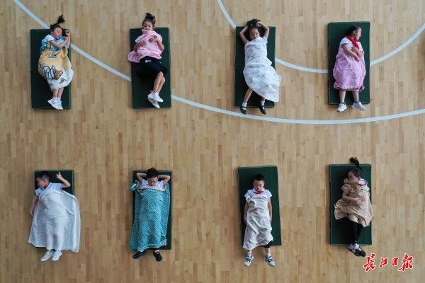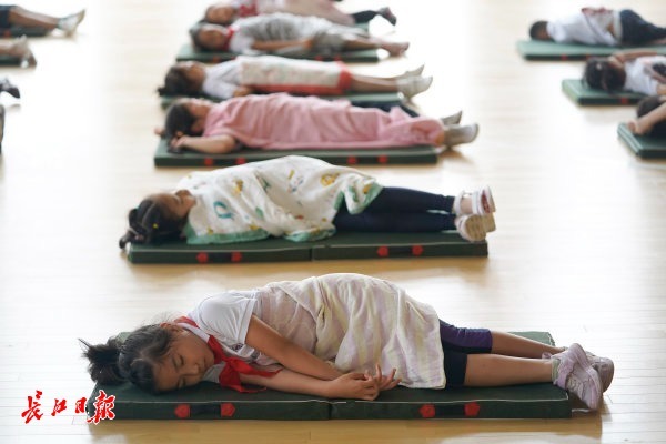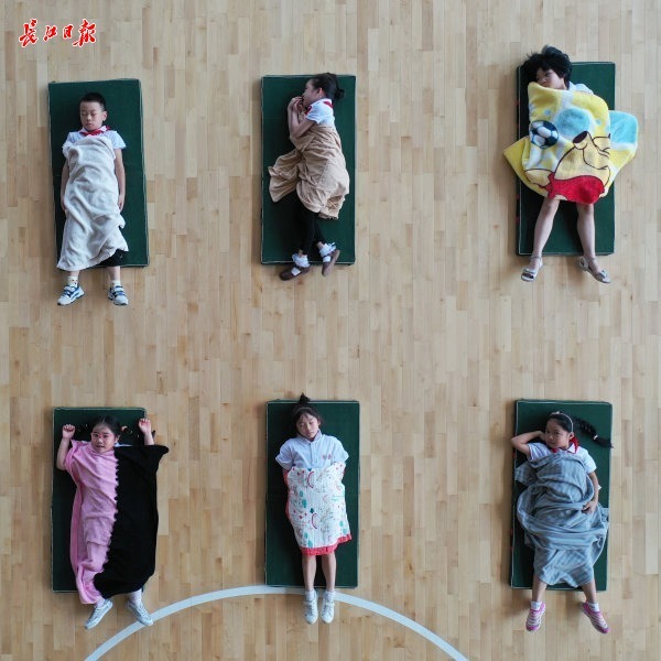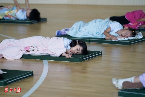 长江日报大武汉客户端9月1日讯(记者刘嘉 通讯员宋骥)小学生午休不用趴桌睡!中午1:00,江汉区红领巾精武学校的室内体育场里,地上已经整齐摆好小睡垫。孩子们排队走到各自睡垫上躺下,盖上自己的小被子,舒舒服服地睡起午觉。