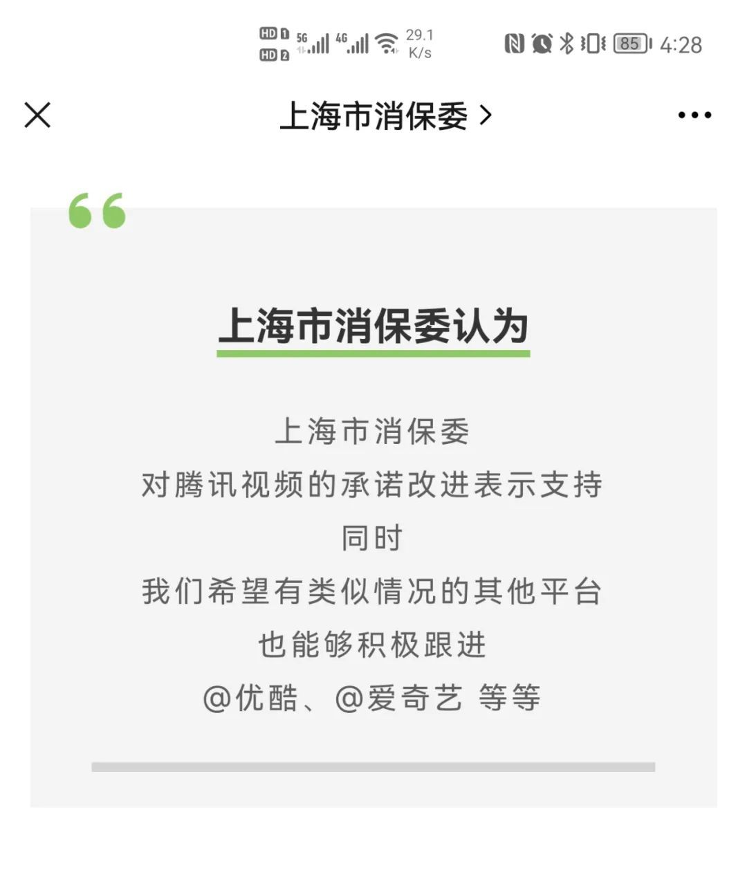 今天,上海市消保委对腾讯视频的承诺改进表示支持,同时点名优酷和爱奇艺,“希望有类似情况的其他平台也能够积极跟进”。