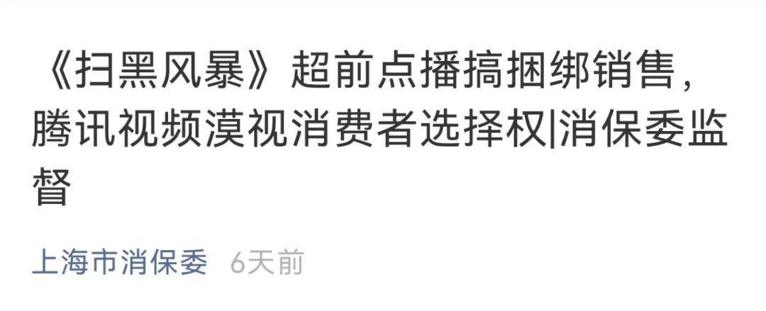 此前,上海市消保委认为:腾讯视频在《扫黑风暴》的超前点播中,既然是按集收费的,那消费者就有权选择他要看的那一集。所谓“按顺序解锁观看”,涉嫌捆绑销售,是对消费者选择权的漠视。