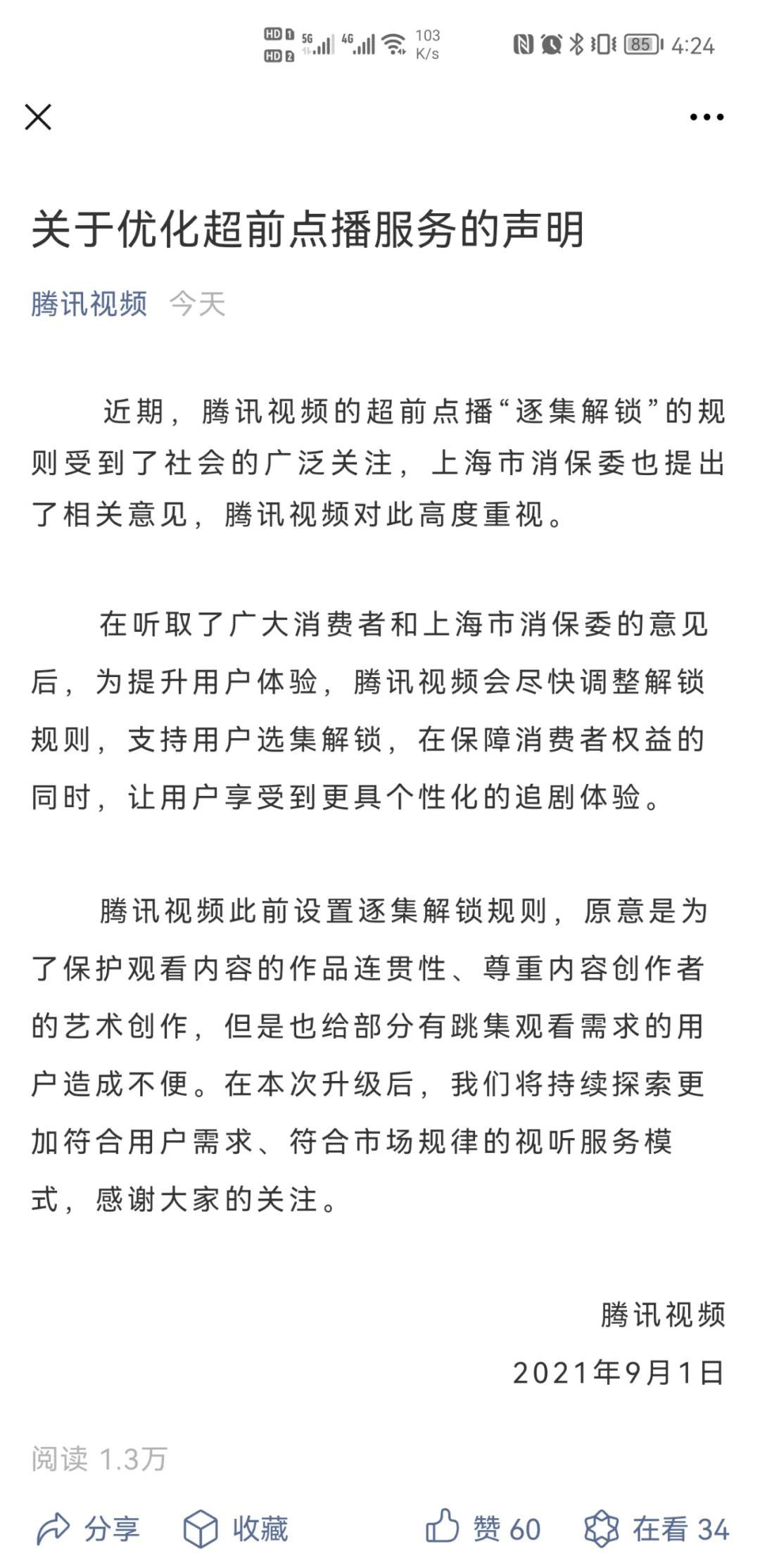 针对超前点播“逐集解锁”的规则,今天,腾讯视频发布《关于优化超前点播服务的声明》。