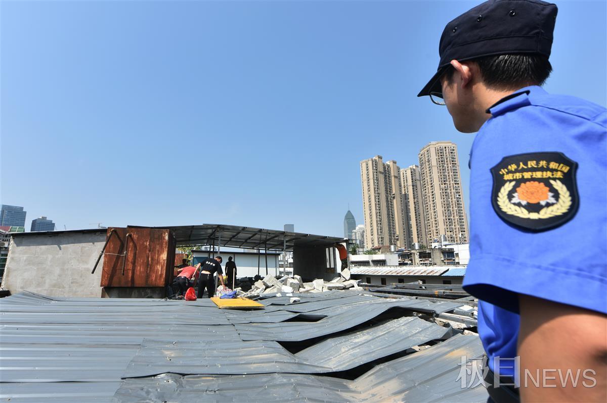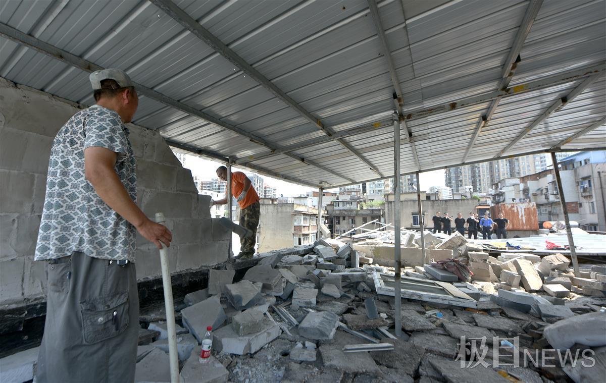 已经打围且即将拆迁的大楼楼顶,竟然一夜之间又“多了一层”,这是有人打起了“多捞一笔”的主意,而这主意注定成为空想。9月1日,武汉市江岸区西马街道综合执法中心组织执法力量将这处面积达200余平方米的楼顶违建全部拆除。