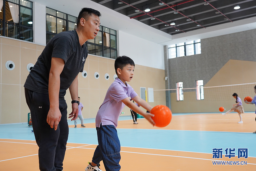 排球课上,同学们正在两两一组进行训练。新华网 刘文静 摄