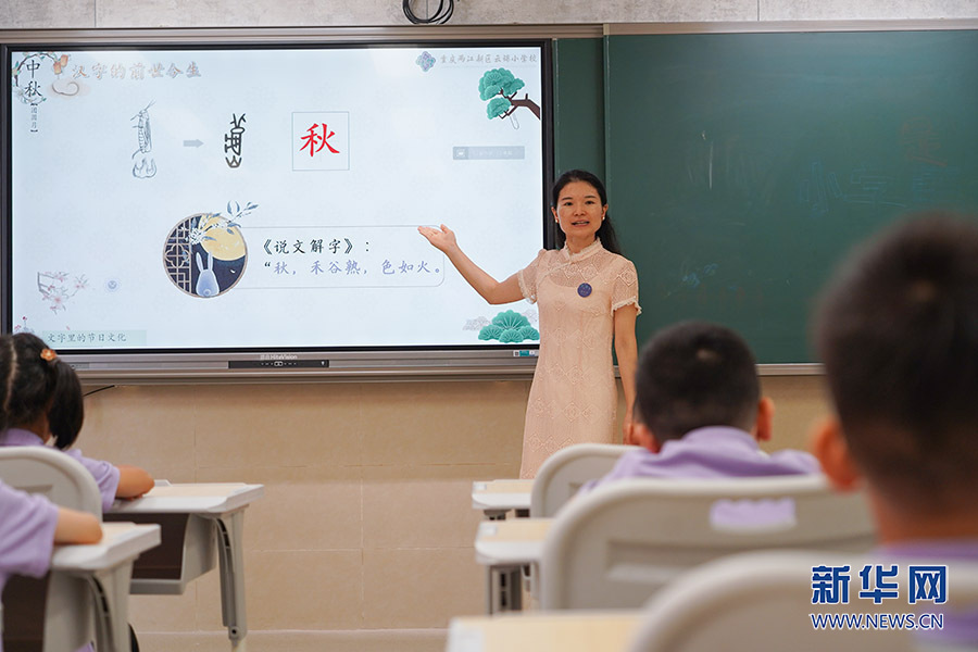 在汉字探微——文字里的传统文化课程上,老师正在带领同学们认识甲骨文,学习文字背后的传统文化。新华网 刘文静 摄