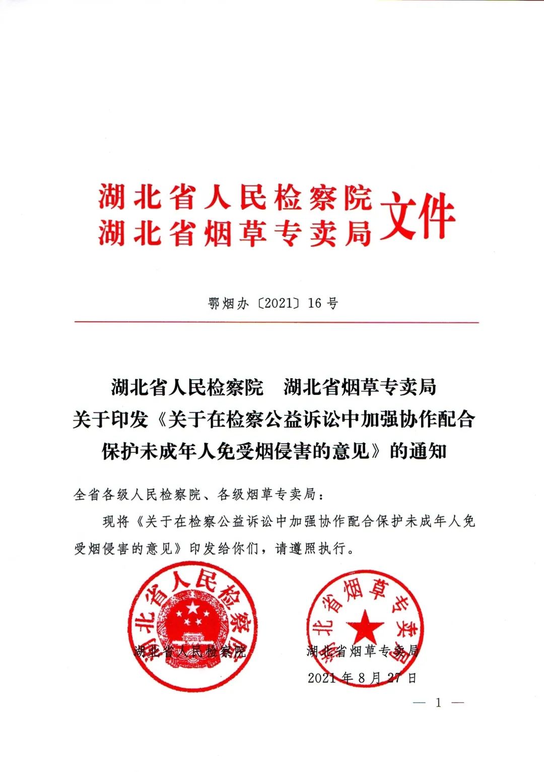 近日,湖北省人民检察院、湖北省烟草专卖局联合印发了《关于在检察公益诉讼中加强协作配合保护未成年人免受烟侵害的意见》。