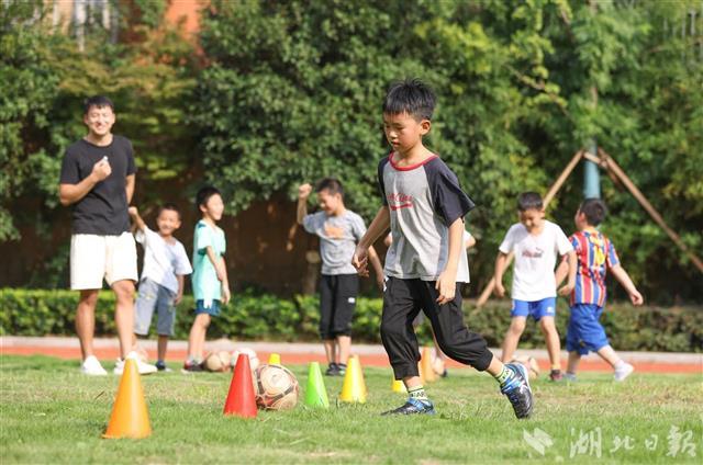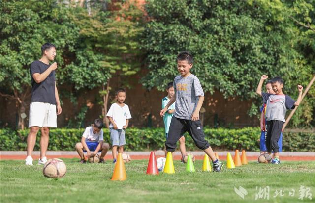 9月2日,武汉市江汉区武汉关小学,小学生们在课后托管班上练习踢足球。