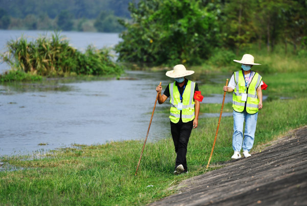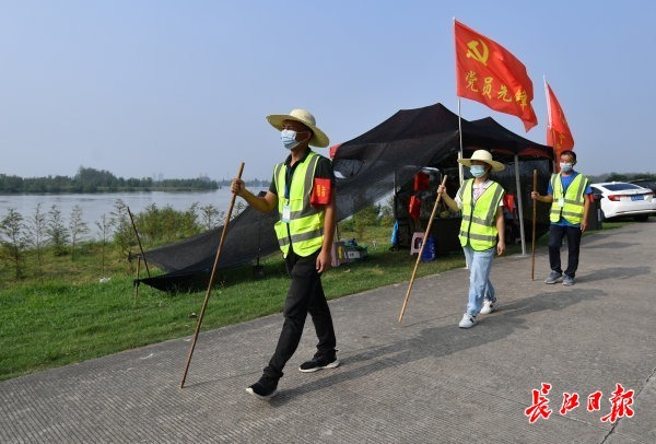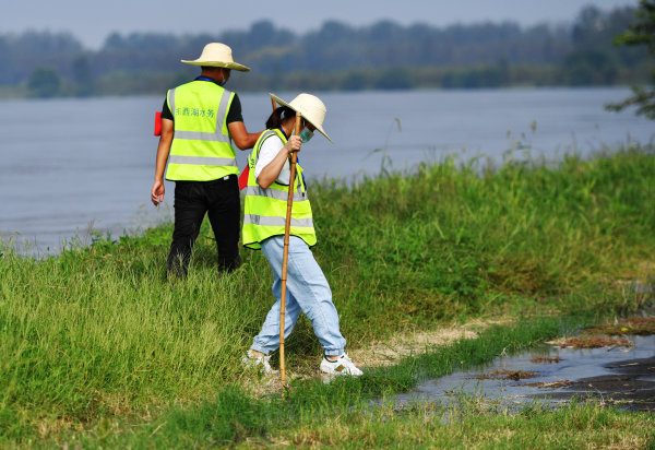 长江日报大武汉客户端9月2日讯 9月2日,在汉江东西湖段慈惠街防汛值守点,八向大队2号哨棚的龚奔虎和石萍等值守人员在汉江堤坡下巡查。受上游来水和区间汇水影响,汉江中下游水位仍有上涨趋势。由街道党员干部和辖区企业职工组成的防汛队伍,目前24小时轮流值岗,守护堤防。