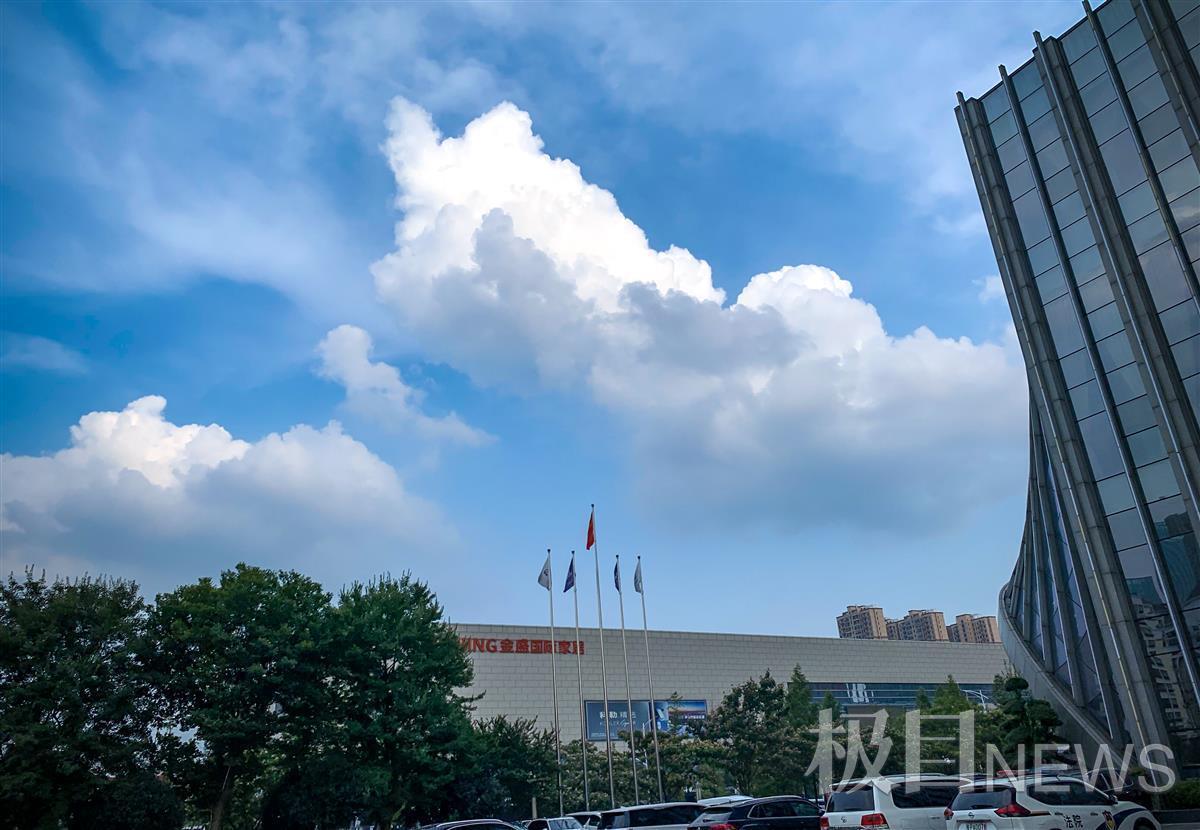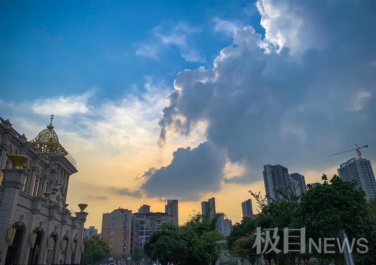9月3日下午5时40分,武昌天空一半蓝天白云,另一半太阳被乌云稍稍遮掩,太阳周边出现艳丽霞光,随即下起了雨点,但这场太阳雨下了不足十分钟,太阳驱散乌云,又是一片蓝天白云。