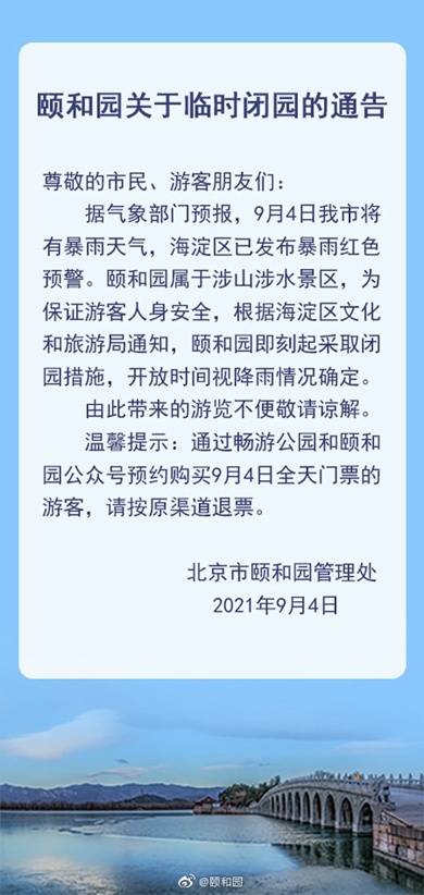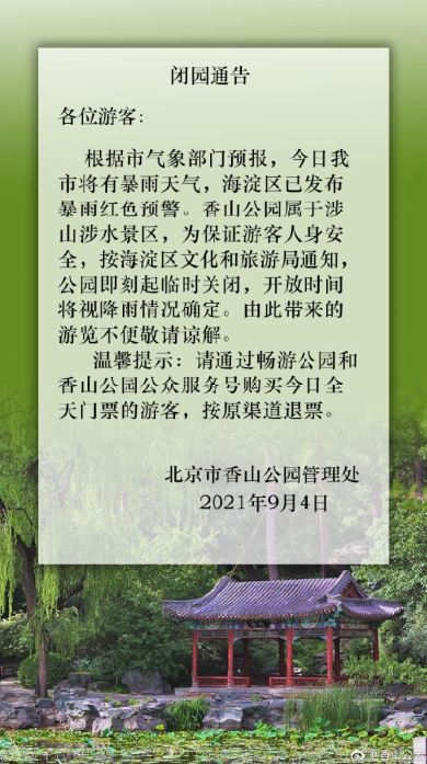 根据北京市气象部门预报,今日(4日)北京市将有暴雨天气。颐和园、香山公园和北京植物园属于涉山涉水景区,为了保证游客人身安全,即刻起临时关闭,开放时间将视雨情而定。
