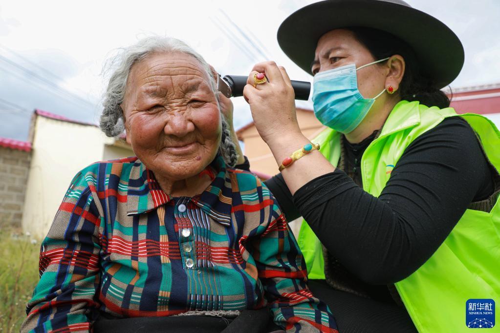 9月2日,在甘肃甘南碌曲县社会综合福利院,护理人员给藏族老人吉尕理发。新华社记者 杜哲宇 摄