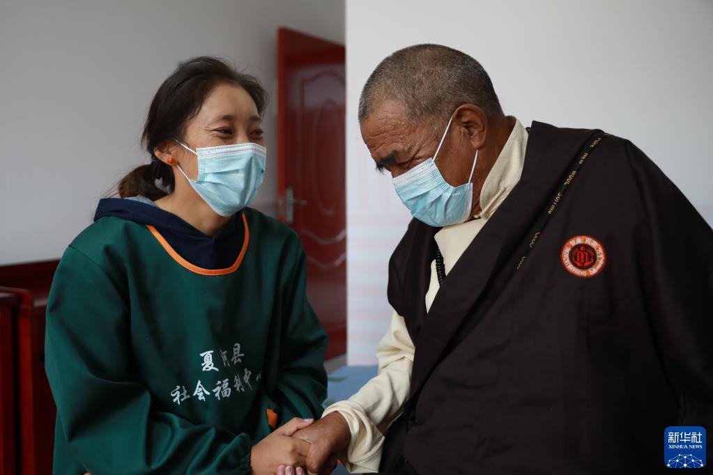 9月3日,在甘肃甘南夏河县拉卜楞综合社会福利中心,护理人员帮助老人做按摩。新华社记者 冯亚松 摄