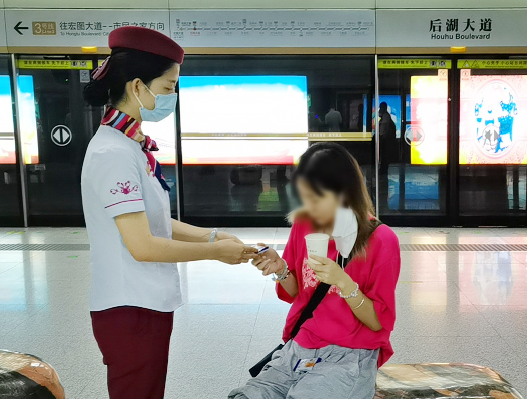 9月4日上午9时许,武汉轨道交通3号线后湖大道站站台岗李天祥接送列车时,看到一名年轻女乘客在站台候车时倒地,立即上前将她扶至站台座椅上休息,并报告值班站长朱星蓓。