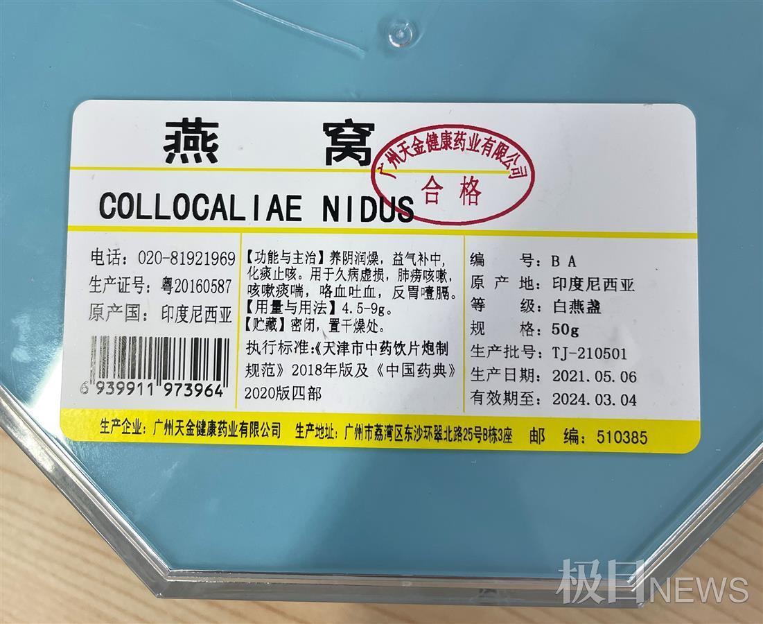 记者看到,陈女士购买的这盒燕窝,生产企业为广州天金健康药业有限公司,标注的生产日期为2021年5月6日,有效期至2024年3月4日。干盏燕窝在保质期内会出现霉变吗?王思露称:有这个可能,原因主要有以下几方面。
