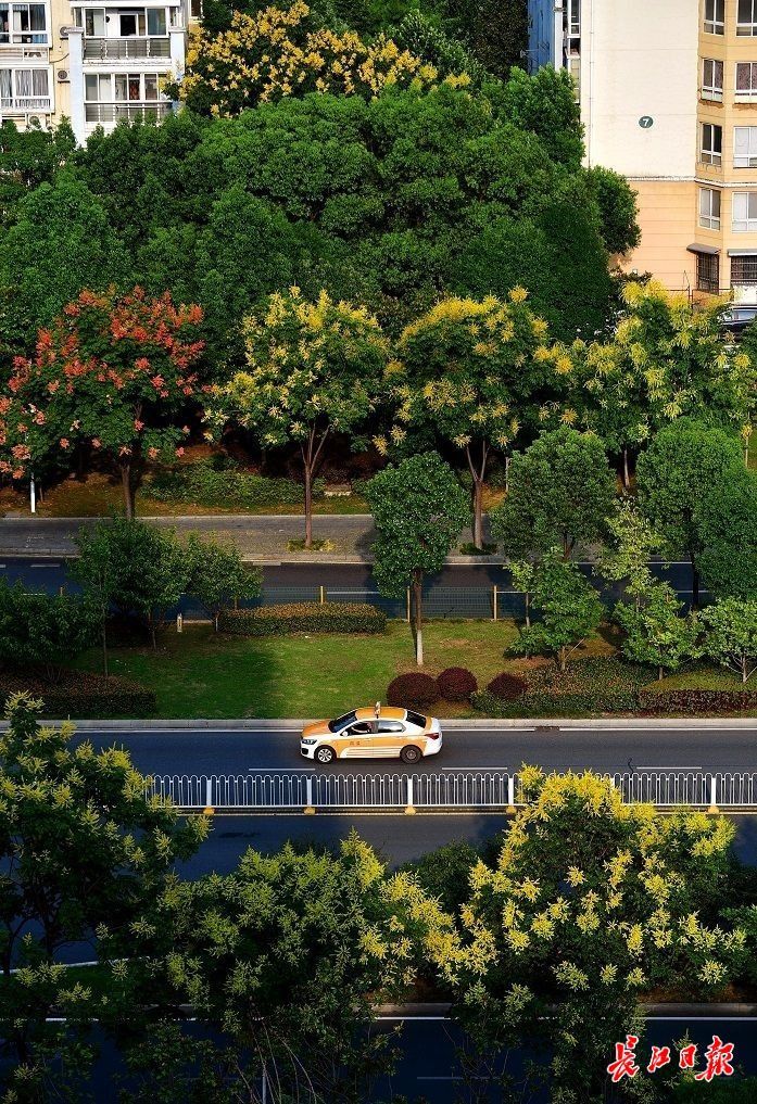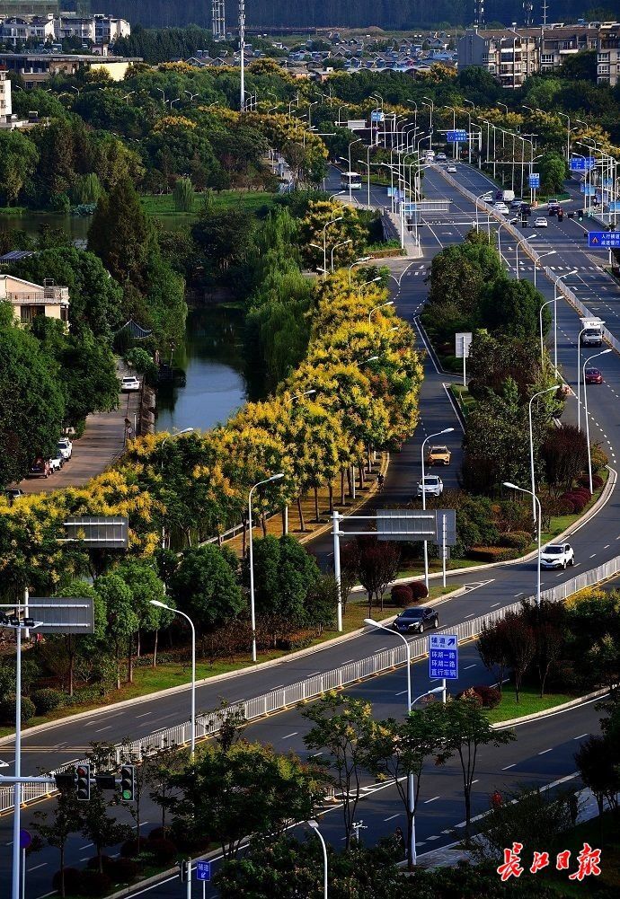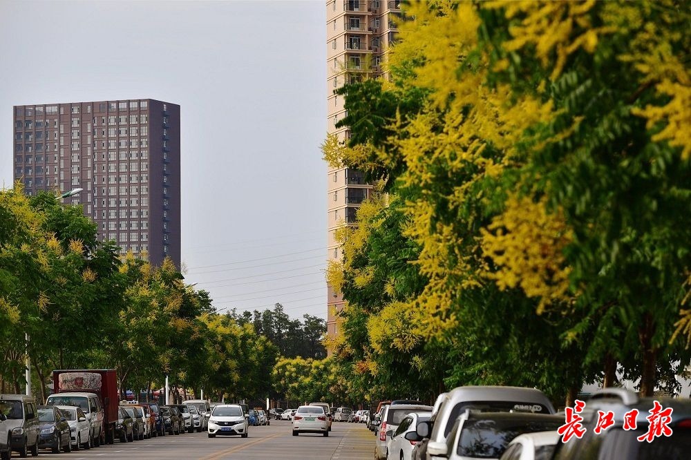 长江日报大武汉客户端9月5日讯 9月5日,金银湖约1公里长的马池西路两旁,300多棵高大的栾树迎来盛花期,繁密的金黄色花团挂满枝头,细小的落花铺满人行道,将这段路装扮成耀眼的“金色大道”。附近的环湖路上,人行道边栽种的栾树也同样给马路镶上了“金边”。