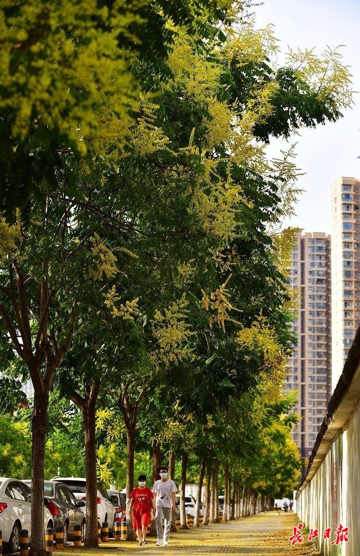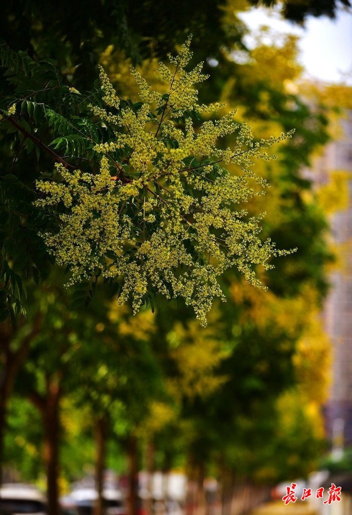 据了解,复羽叶栾树是武汉行道树的“主力军”之一,公园、绿地也很常见。每年夏末秋初开花时,其硕大的聚伞形圆锥花序布满枝头,每个花序能开出上千朵小花,盛花期一棵大树就是一场盛景。(长江日报记者李永刚 摄影报道)