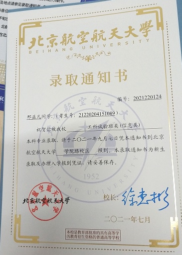 骨折和肺炎改善后,邢益凡立即重返课堂,如愿参加并顺利完成了2021年高考。成绩出来了,邢益凡不负众望,高考成绩优异,645分!