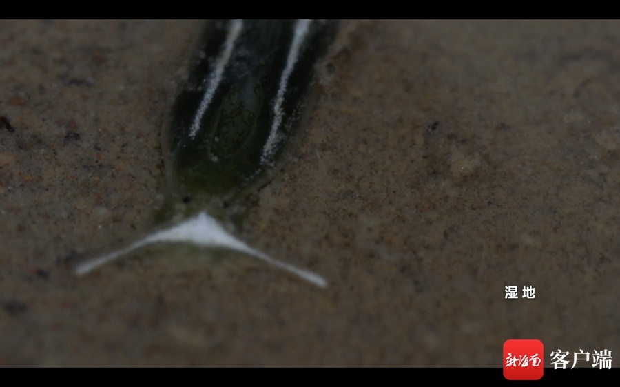 这里还有一个特殊的群体“白边侧足海天牛”,五毫米大的它们,生活在东寨港近岸红树间。额头顶端两只触角、两颗豆点的黑眼睛格外吸睛,额头和两侧是显眼的白色。
