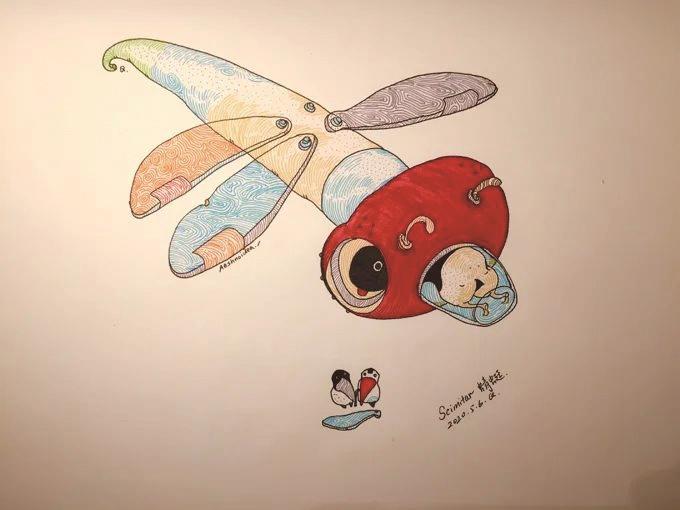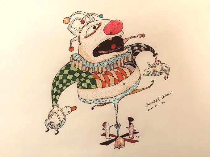 Mr.Q画作《Joker之天平》《套娃挠痒痒》《匹诺曹和透明人》《蜻蜓》(从左到右