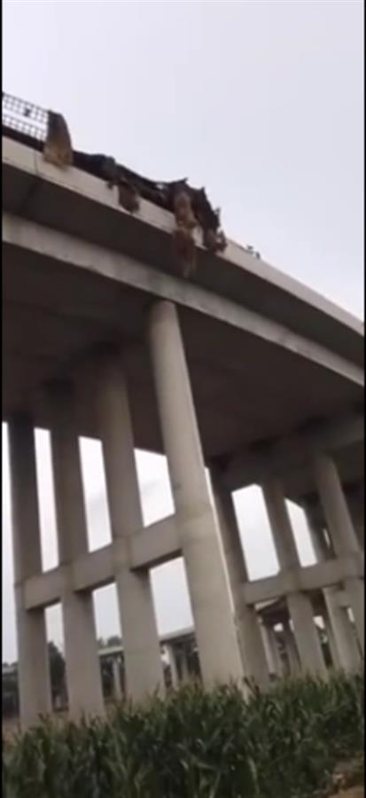 现场视频显示,车辆侧翻后,数十头牛分散坠落在桥下的玉米地,全部死亡,还将不少玉米植株压倒。有吊车到场,将死牛吊回高架桥上,现场有不少村民在旁围观。