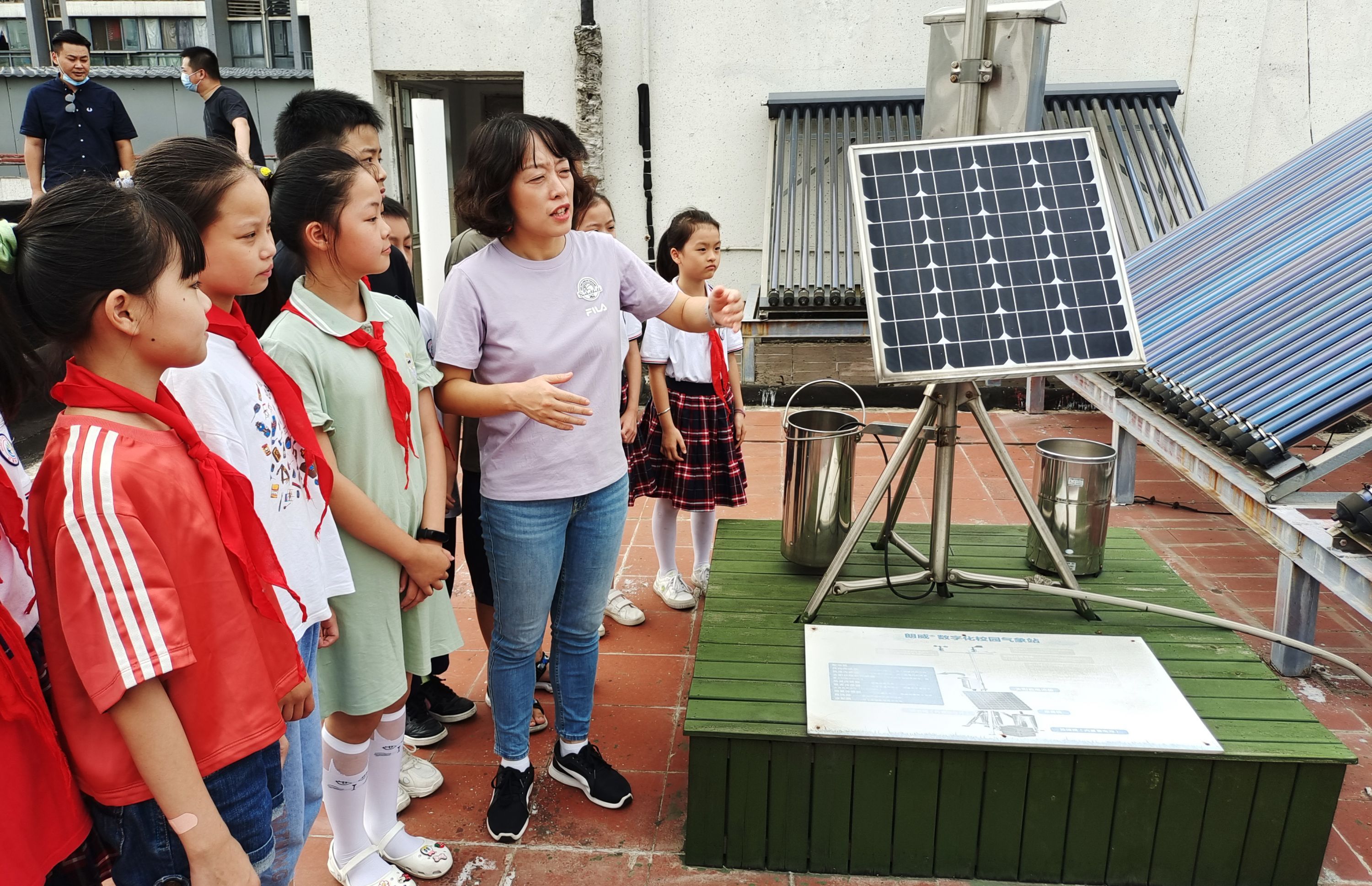 段敏介绍,红旗村小学是一所有着70多年历史的老校,学校开展环保特色教育已经有30多年,30多年来,不管校长如何更替,学校始终坚持着环保特色,从垃圾分类、太阳能发电和节能低碳环保,学生和老师一批又一批的延续环保精神。“我们学校的办学理念就是播撒绿色种子,奠基和谐人生。我们的校训就是阳光心态,绿色行动,我们一代又一代红旗人都是践行这种节能低碳的环保理念。”