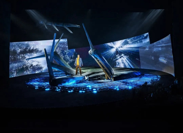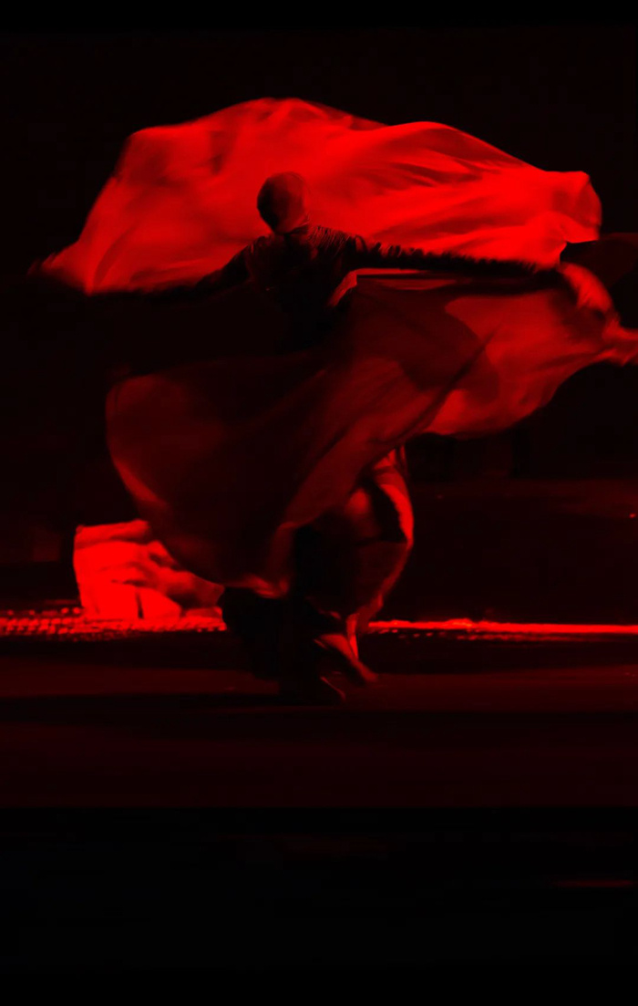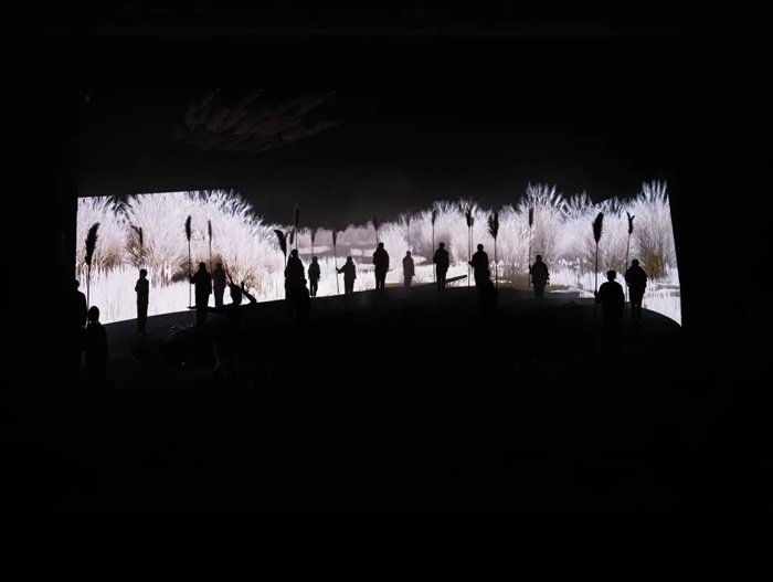 《大泽鹤恋》的舞美设计是从民间的提线木偶中获得灵感,用两组机械装置组成一双环抱的手,又像一对翅膀。手与翅相互缠绕,通过转台大开大合,舞台空间如同打开的百宝箱,一会儿是傍晚喧闹的场院、一会儿是温暖的炕头、一会儿是芦苇荡漾的湿地……最终定格在狂舞的巨幅纱巾中,将晶莹的雪片猛地吹荡起来。