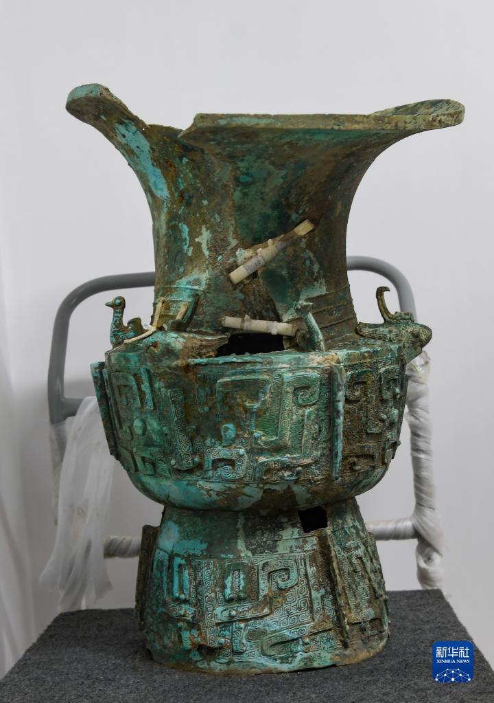 这是在四川省文物考古研究院三星堆考古研究所拍摄的三星堆遗址3号“祭祀坑”出土的铜尊(9月2日摄)。 新华社记者 王曦 摄