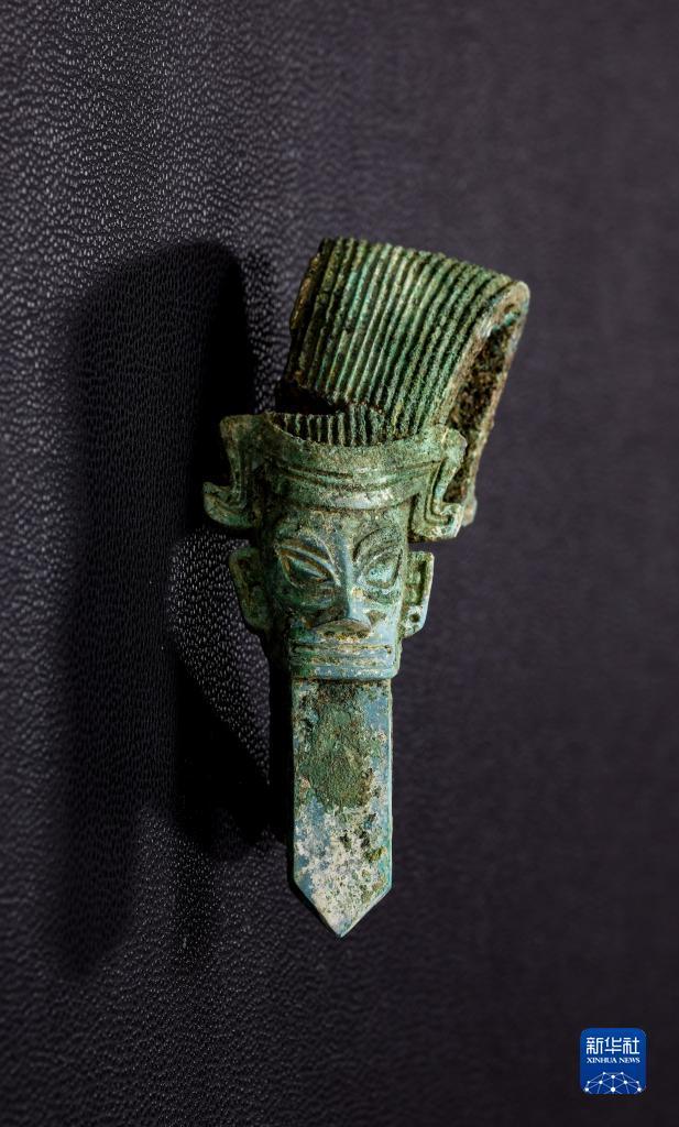 这是在四川省文物考古研究院三星堆考古研究所拍摄的三星堆遗址3号“祭祀坑”出土的青铜头像(9月3日摄)。 新华社记者 王曦 摄