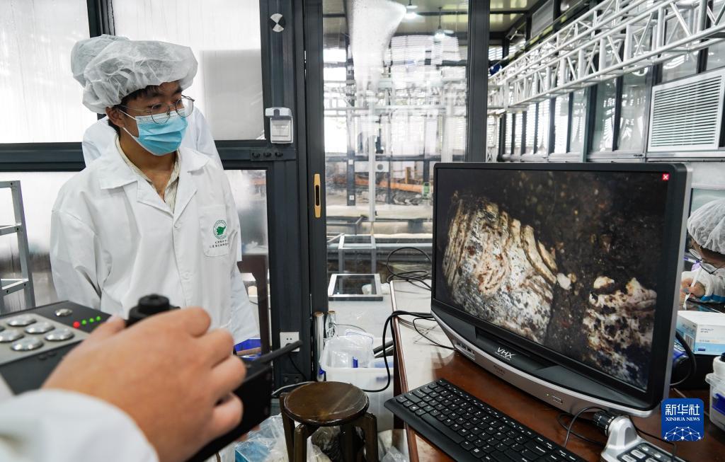 在四川德阳广汉市三星堆遗址,文保人员操纵专业设备对5号“祭祀坑”内进行显微观察(9月7日摄)。 新华社记者 王曦 摄