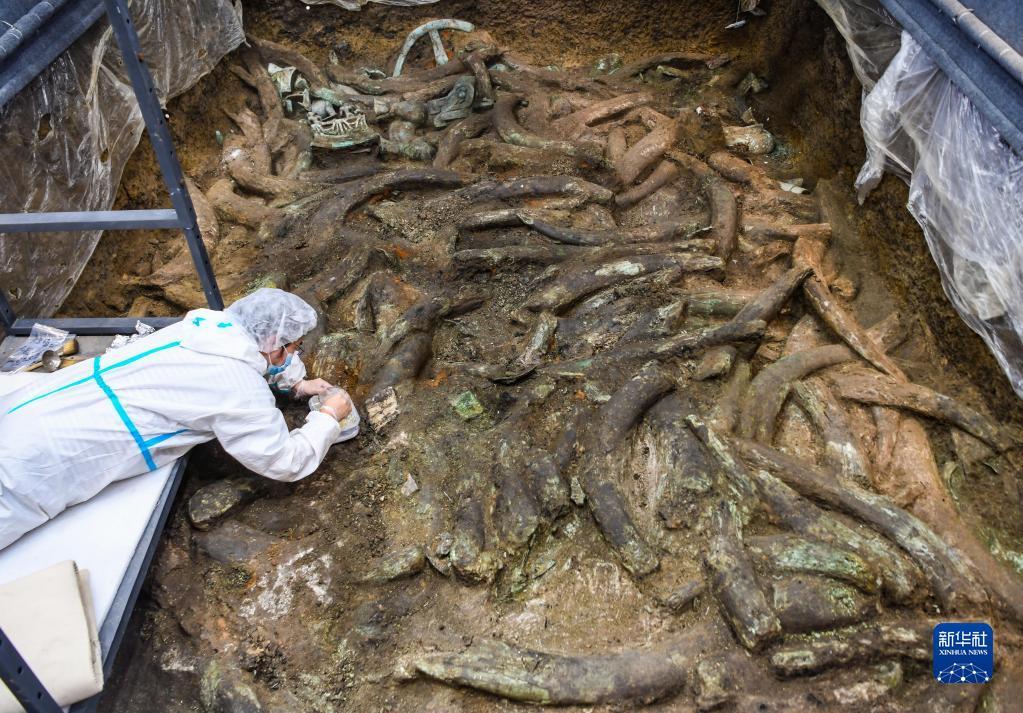 据了解,目前3号“祭祀坑”发掘已近尾声,4号“祭祀坑”发掘已经结束,5、6号“祭祀坑”因面积较小、深度较浅,将被提取到实验室“解剖”,7、8号“祭祀坑”刚刚到文物层,大中型青铜器、象牙、玉石器等铺满了整个“祭祀坑”,犬牙交错、层层叠叠,令人叹为观止。
