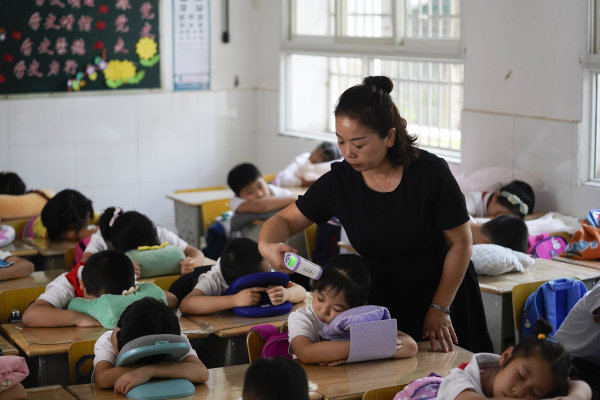 刘莺让学生拿出带来的小枕头午休并进行第二次测温。