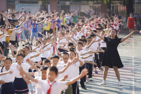 8时10分到8时半是早操时间。刘莺带着孩子们来到操场上,引导他们排队做操,她亲身示范每一个动作,纠正动作不到位的学生。