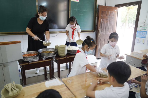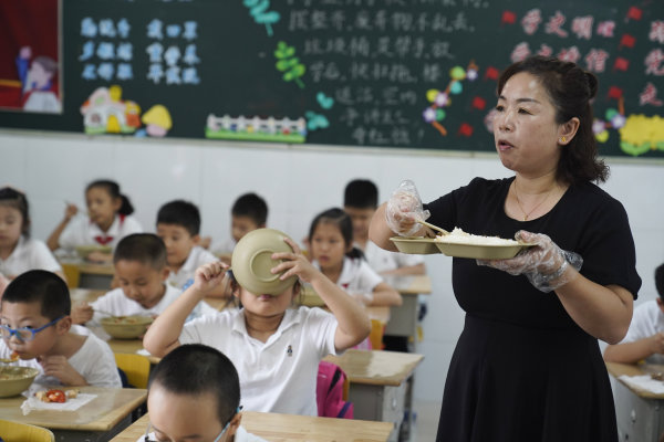 等刘莺给52个学生挨个分发完饭菜后,“干饭王”们又来盛第二碗了。直到12时20分,有的孩子已经吃完了两碗饭,刘莺才端起了自己的餐盘,一边在班上巡视,一边大口吃起来。