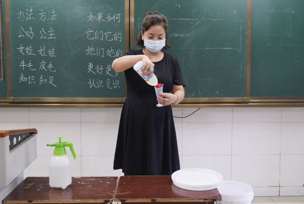 等所有孩子都被家长接走以后,下午5时50分,刘莺回到教室,开始了每天40分钟的消杀工作。