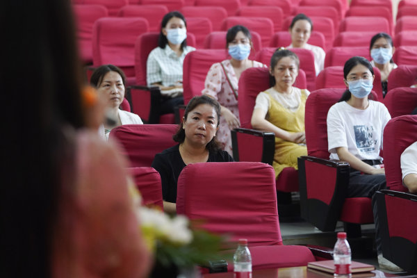 下课以后,刘莺带着孩子们认真做眼保健操,然后抱着52本练习本回到办公室,却没时间批改这些课堂作业。上午10时半,第三节课上课铃响以后,她来到阶梯教室,参加学校一年一度的“德艺双馨 青蓝共辉”师徒结对工作会,并与刚入职的新晋班主任曾倩签订结对协议。