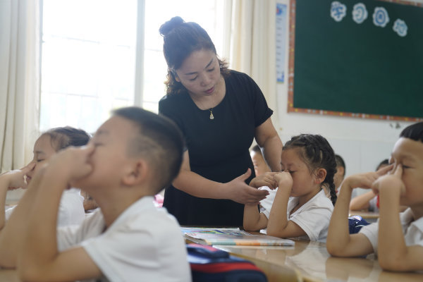 第二节课下课后,刘莺带着孩子做眼保健操。