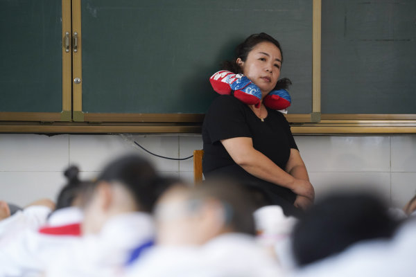 中午12时45分,刘莺让学生拿出带来的小枕头,让他们午休,自己关窗、关灯,将空调调到合适温度。有孩子东张西望睡不着,刘莺就走过去轻拍他的背,帮他安静下来,尽快入睡。有的孩子离空调近,刘莺就给她盖上小披肩。有的孩子因天气干燥流鼻血了,刘莺又赶紧过去处理,帮他止血、清理。孩子们的睡姿被刘莺一一拍下,发在家长群里。午休的一个小时里,刘莺几乎一直在班上走动巡视,等孩子们都睡着了,她才靠在椅背上,坐了几分钟。