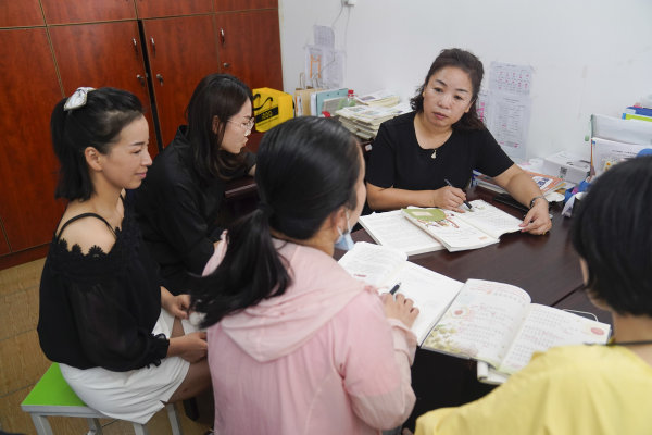 刘莺和同事开展教研活动。